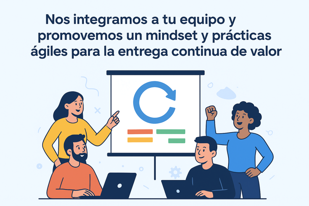 Nos integramos a tu equipo y promovemos un mindset y prácticas ágiles para la entrega continua de valor.